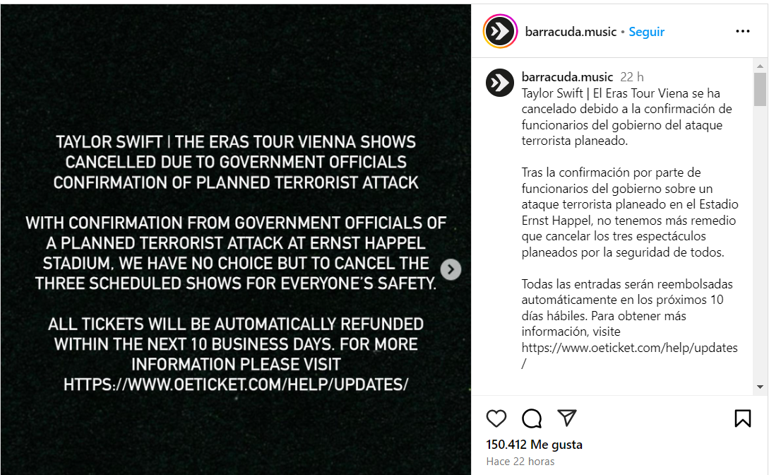 El estadio Ernst Happel iba a recibir aproximadamente a 170 mil fans durante el Eras Tour del 8 al 10 de agosto. Este incidente se suma a un atentado en Viena en noviembre de 2020 y a la detención de cuatro sospechosos en diciembre por planear un ataque en la catedral de San Esteban.
