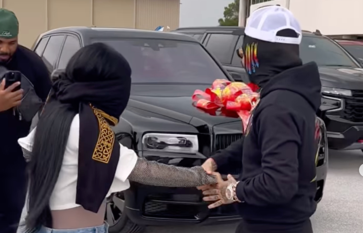 En un video compartido en las redes del norteamericano, se observa a la cantante bajando con los ojos tapados de un avión privado, y Tekashi le da la sorpresa del auto.