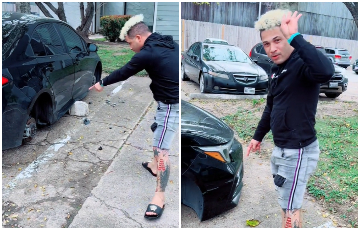 “Mira, esto es tremenda falta de respeto, esto solo se ve en Houston”, comentó Molina mientras recorría su auto, que quedó sobre bloques. Añadió con sarcasmo: “Esto no se ve en ningún lado, ven para que la gente lo vea bien rico”.