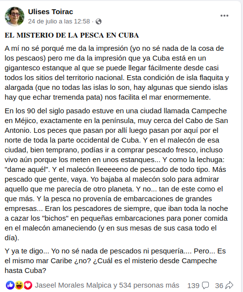 En su comentario, Toirac, quien no se considera experto en la materia, expresa su asombro sobre “el misterio de la pesca en Cuba”, haciendo notar que la Isla ya es, en sí misma, un enorme estanque. Enfatiza que, estando Cuba rodeada de mar, pescar no debería representar ninguna dificultad.