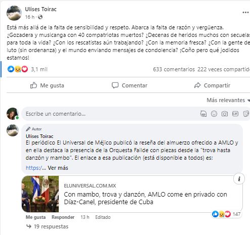 Toirac arremetió contra los dirigentes y su despampanante recibimiento a Andrés Manuel López Obrador, presidente de México, durante su visita a Cuba la pasada semana, cuando aún hay cuerpos bajo los escombros sin ser rescatados, familiares sufriendo y personas hospitalizadas esperando recuperarse tras la explosión del hotel Saratoga.