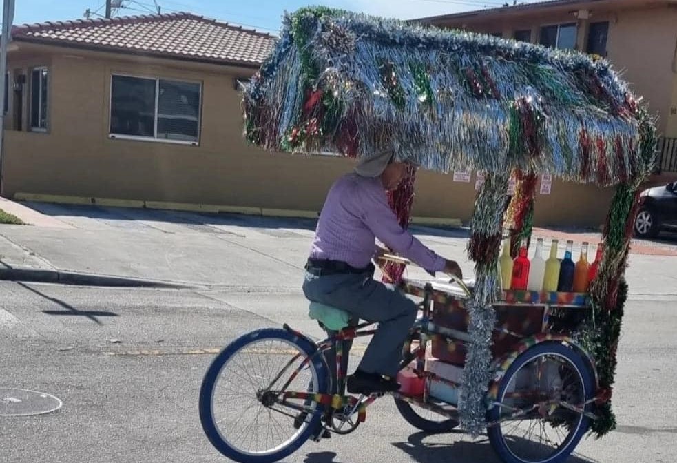 Las imágenes de un hombre en bicicleta vendiendo granizado por las calles de Hialeah se han vuelto virales en las redes sociales.