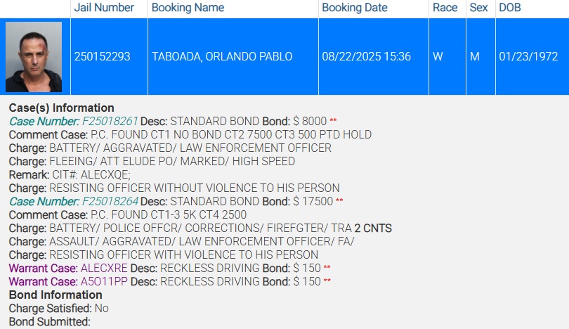 Taboada se encuentra detenido sin derecho a fianza y enfrenta seis cargos graves, entre ellos agresión agravada a un agente del orden público, huida y elusión a alta velocidad. Hasta la tarde de este lunes, el referido sujeto permanecía detenido en el Centro Correccional Turner Guilford Knight.