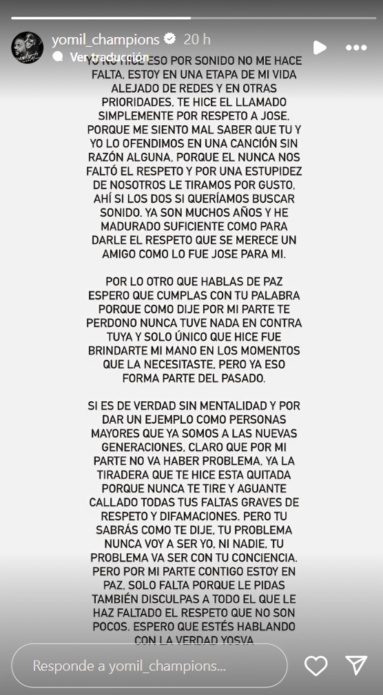 “Este mensaje es para Chocolate y otro canal que se llama Flow Urbano, que sin mi consentimiento subieron las tiraderas que en un momento tuve con Jose [El Taiger] por inmadureces de mi parte. Necesito que las borren lo más pronto posible, se los pido de favor”, escribió el también compositor en sus historias de Instagram.
