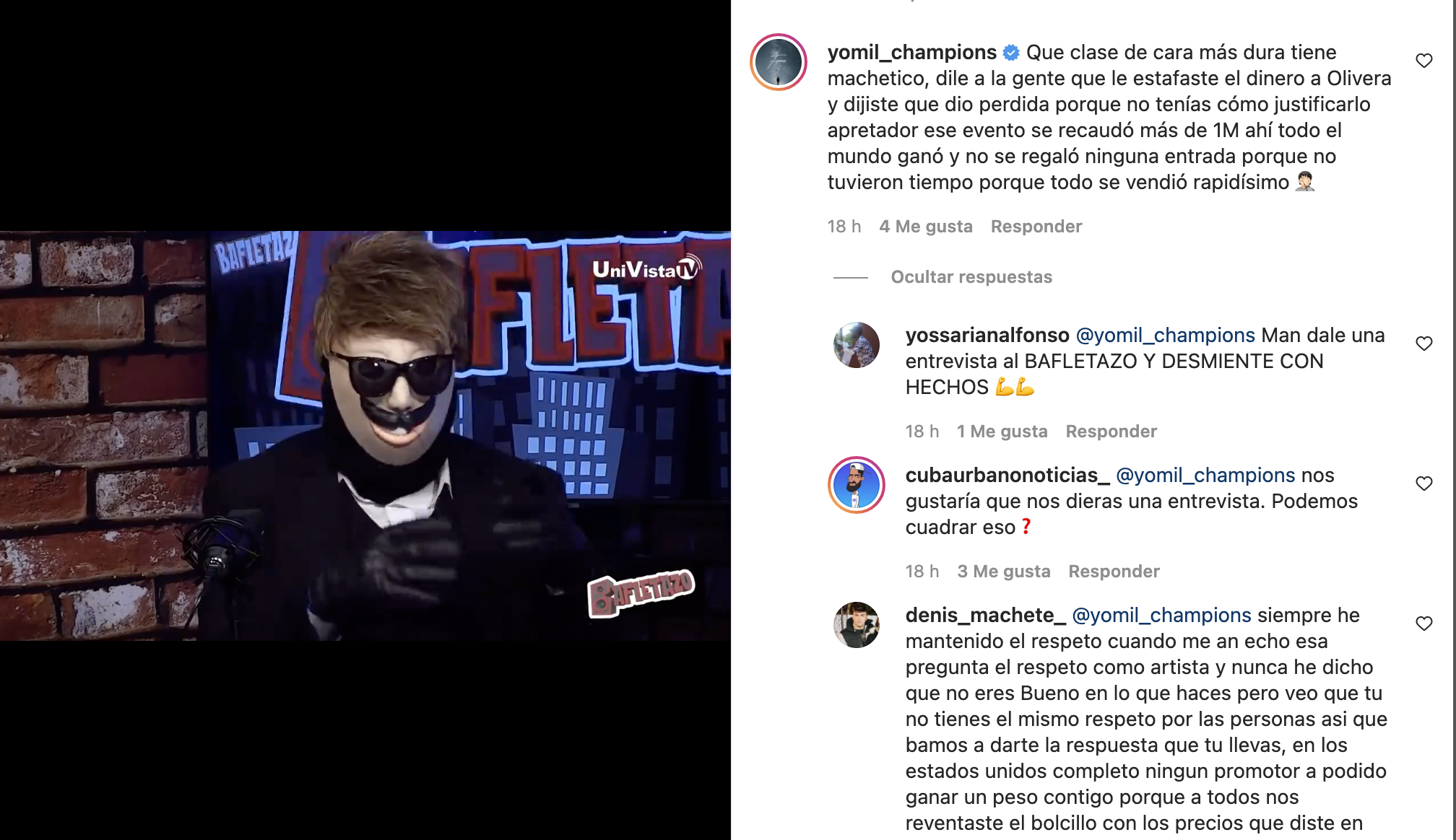 Una publicación en la cuenta de Instagram del youtuber Cuba Urbano Noticias, donde se mostraba un fragmento de la intervención del promotor de eventos Denis Machete, trajo consigo la respuesta de Yomil Hidalgo.
