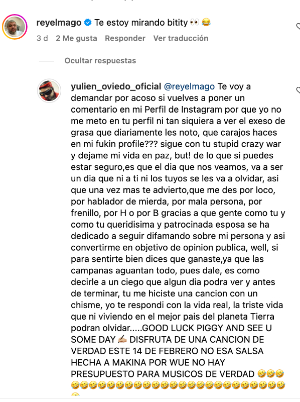 “Te voy a demandar por acoso si vuelves a poner un comentario en mi perfil de Instagram, porque no me meto en tu perfil, ni tan siquiera a ver el exceso de grasa que diariamente les noto, ¿qué caraj*s haces en mi fuki*n profile???”, escribió el músico.