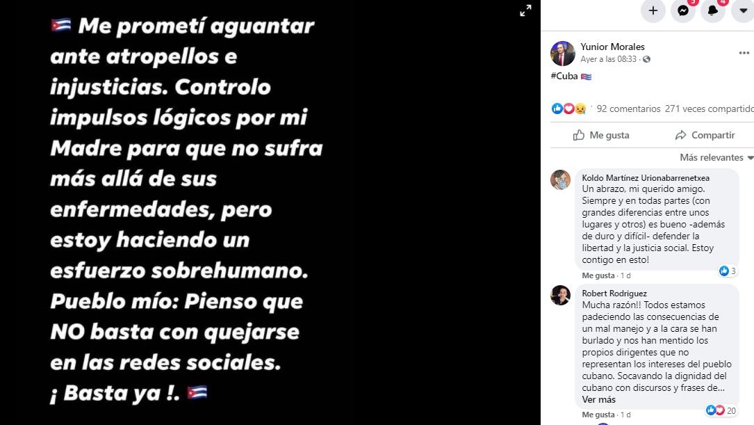 El comunicador cubano mostró su frustración y dijo que “los que apoyan esto son unos miserables y no aman al pueblo cubano”. “¡Algunos tenemos razón! (Vuelvo a ser directo: Los que apoyan esto son unos miserables y no aman al pueblo cubano)” escribió en Facebook.